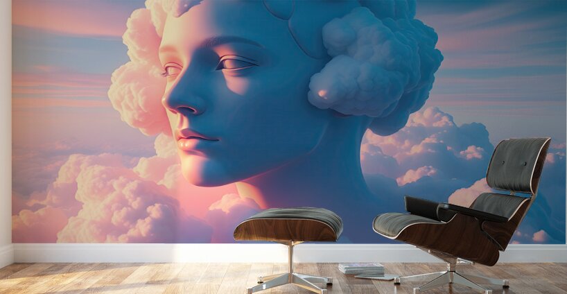 The image shows a woman's face, whose hair is made up of big, puffy clouds. She has a serious expression, and her lips are pressed together. She is engulfed in a sea of clouds, which are all shades of pink, blue, and white. The sky is a pale blue with a hint of orange from the setting sun. The image has a surreal and dreamlike quality. It looks like a woman trapped in the clouds, but it’s also like she’s a cloud goddess who has risen to the heavens. It’s a beautiful image that evokes a sense of mystery and wonder.
