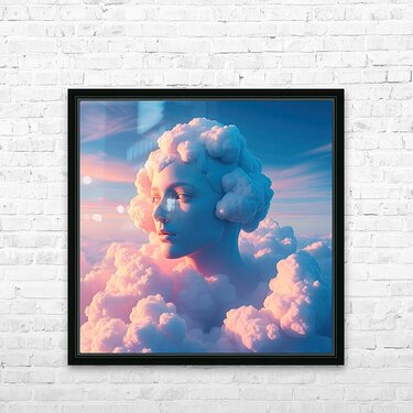The image shows a woman's face, whose hair is made up of big, puffy clouds. She has a serious expression, and her lips are pressed together. She i...[+]