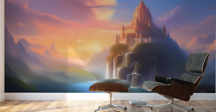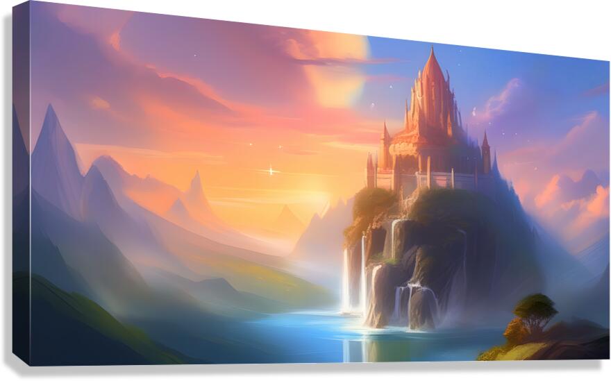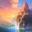 The image shows a majestic, fairytale castle perched atop a cliff overlooking a breathtaking landscape. The castle is detailed and intricate, made of...[+]