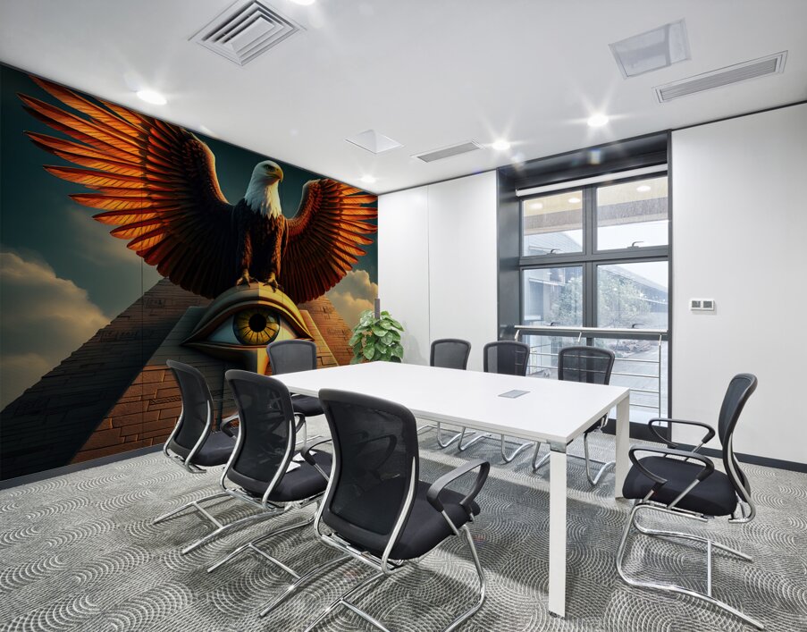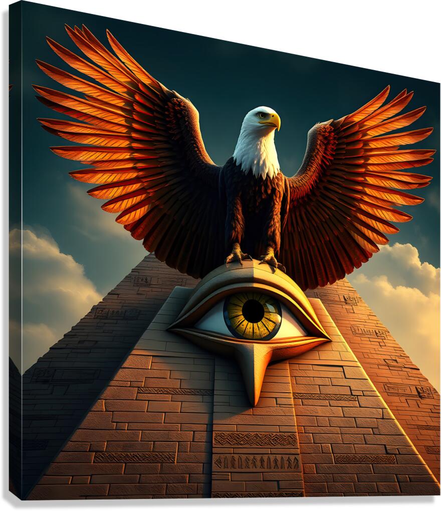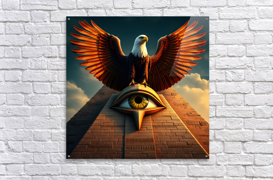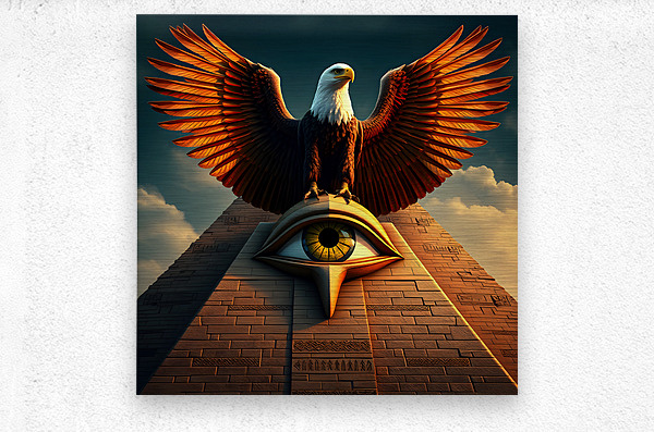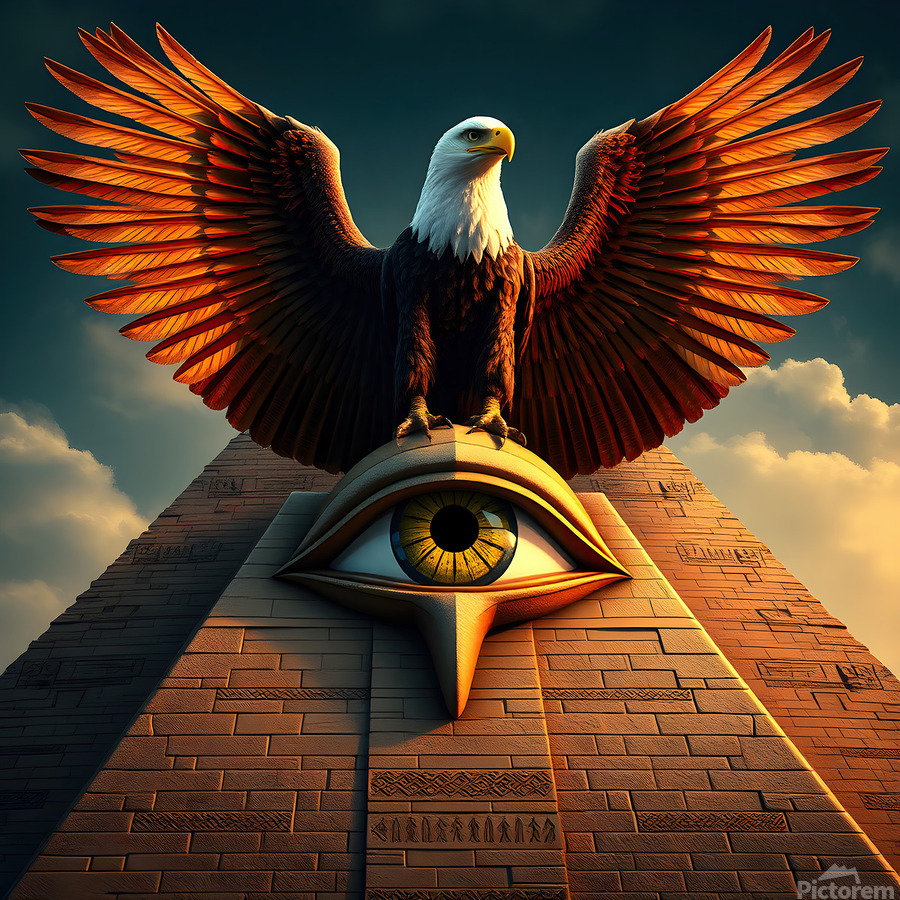 This image shows a bald eagle standing on top of a pyramid with an all-seeing eye on its front. The eagle is spread its wings wide and staring straigh...[+]