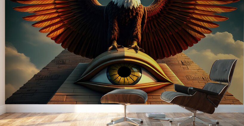 This image shows a bald eagle standing on top of a pyramid with an all-seeing eye on its front. The eagle is spread its wings wide and staring straight ahead. The eye is yellow with a black pupil and is staring ahead also. The pyramid is made of brown bricks and has intricate designs carved into it. The background is a cloudy sky. The image suggests a powerful, watchful presence that oversees all. The eagle and eye are both symbols of power and authority, and the pyramid is a symbol of ancient wisdom and knowledge. The combination of these elements suggests a connection between the supernatural and the earthly realm.