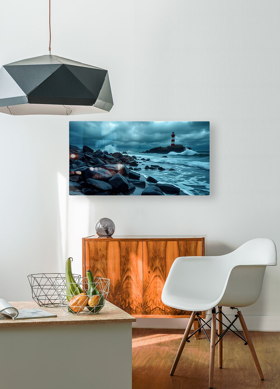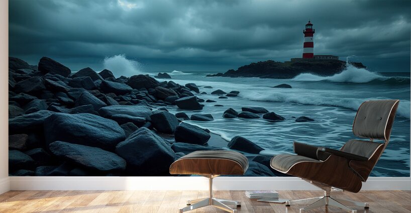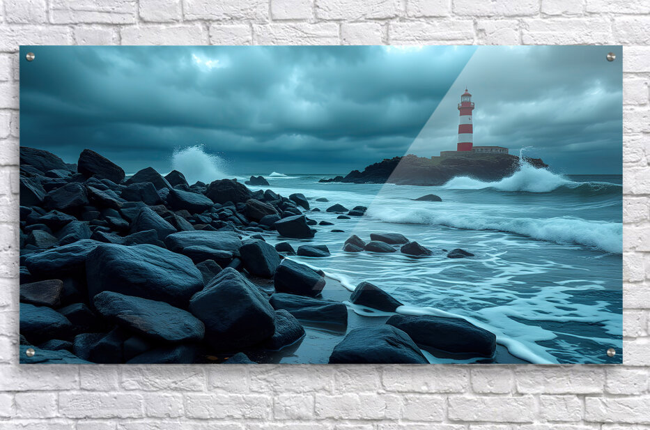 The image captures a dramatic seascape dominated by a tall, white and red lighthouse perched atop a small, rocky island. The lighthouse stands defiant against the backdrop of a stormy, cloud-filled sky. The sea churns and froths, whipped into whitecaps by a strong wind. Large waves crash against the rocky shore, sending plumes of spray high into the air. The foreground is filled with dark, wet rocks, emphasizing the wild, untamed beauty of the scene. The overall palette of the image is dark and moody, with deep blues, grays, and blacks, creating a sense of both awe and foreboding. The lighthouse, bathed in a faint, ethereal glow, acts as a beacon of hope and resilience against the power of nature.