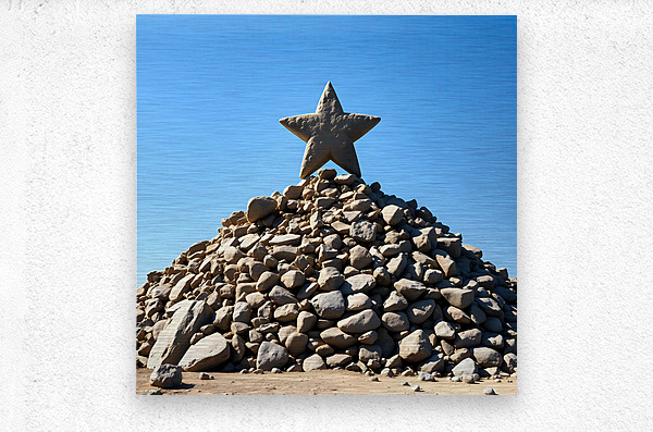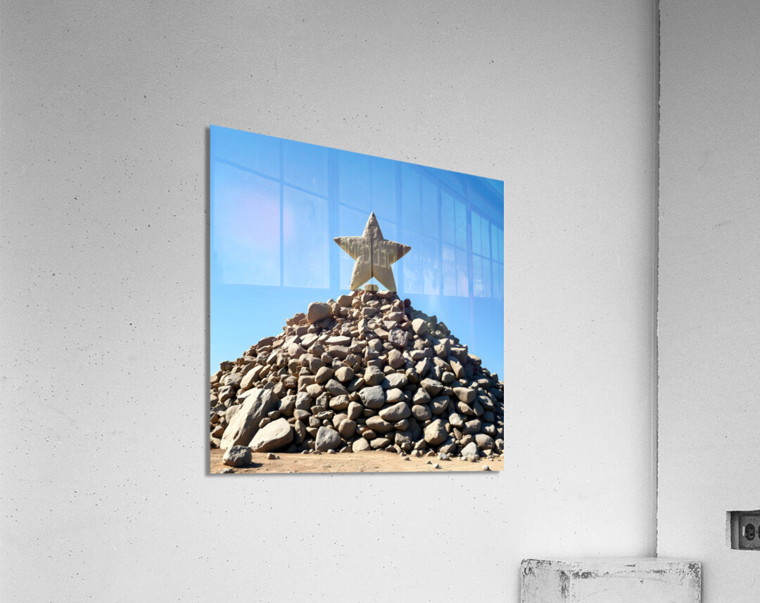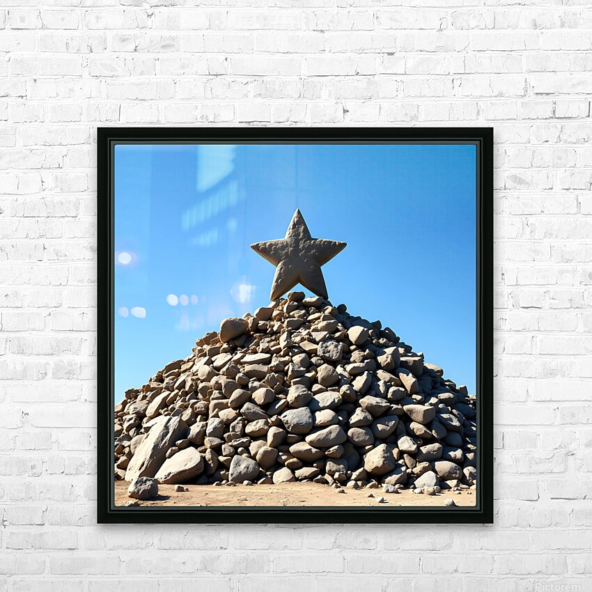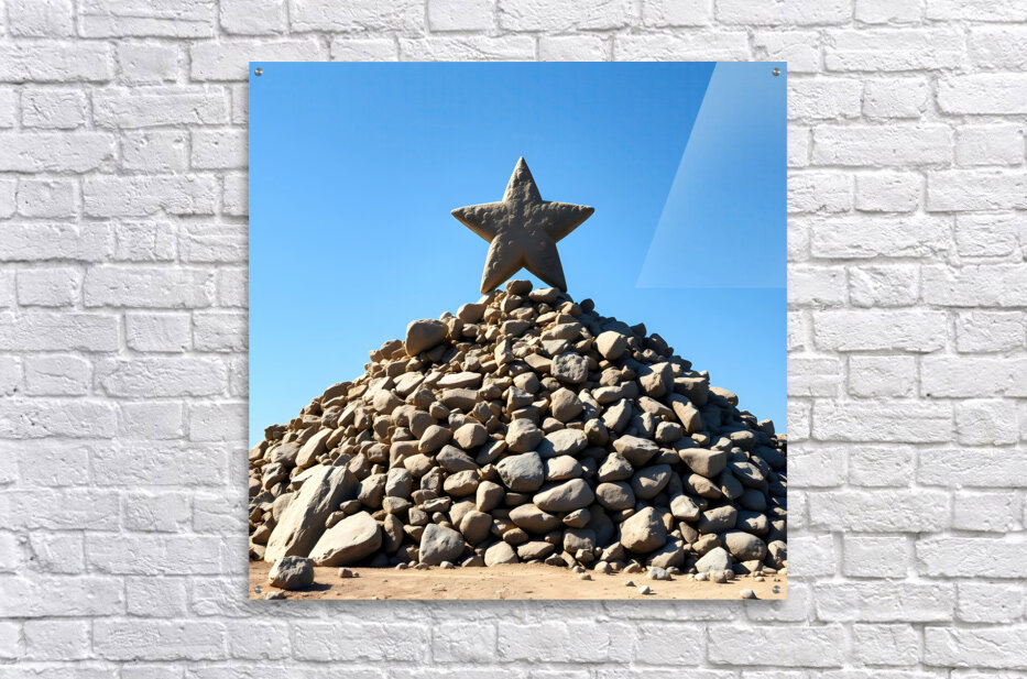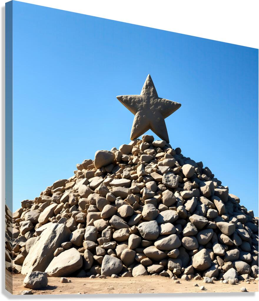 A large rock-star, five-pointed star made of a light brown material sits on top of a tall pile of rocks of various sizes and shapes. The material of b...[+]