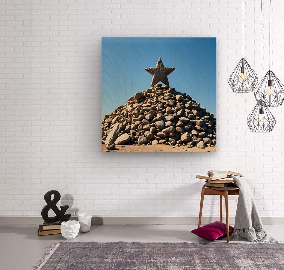 A large rock-star, five-pointed star made of a light brown material sits on top of a tall pile of rocks of various sizes and shapes. The material of both the star and the rocks looks like it could be sandstone. The pile of rocks sits on top of red-toned sand. The background is a clear blue sky, suggesting a sunny day. The perspective of the image is from the ground looking up at the star, so the star appears to be the focal point. The overall feel is stark, simple, and geometric.