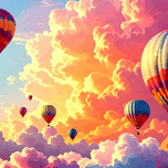 The image showcases a breathtaking scene of numerous hot air balloons taking flight amidst a vibrant, cloud-filled sky. The sky is a magnificent blend...[+]
