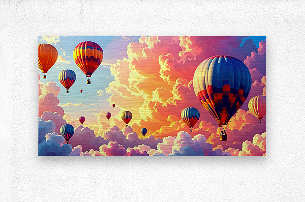 The image showcases a breathtaking scene of numerous hot air balloons taking flight amidst a vibrant, cloud-filled sky. The sky is a magnificent blend of orange, yellow, and blue hues, suggesting it could be either sunrise or sunset. The clouds are fluffy and abundant, painted in strokes of pink, orange, and white, adding depth and texture to the scene. At least a dozen hot air balloons are scattered across the canvas, each unique in its design and coloring. Some balloons are still ascending, while others soar gracefully across the picturesque backdrop. Each balloon casts a subtle shadow on the clouds below, hinting at the gentle movement and tranquility of the scene. The image evokes a sense of freedom, adventure, and the awe-inspiring beauty of nature. The warm, glowing colors create a cheerful and optimistic ambiance, making it a captivating and uplifting sight.
