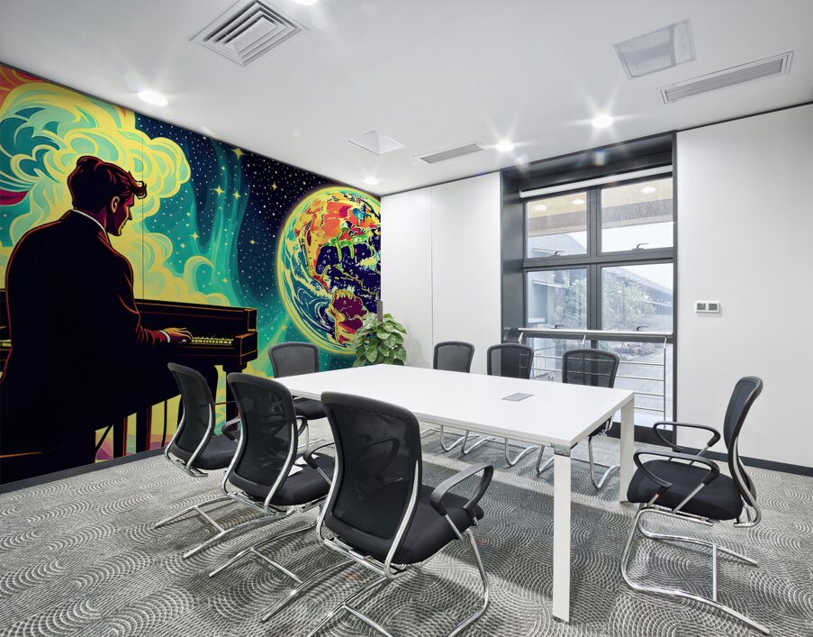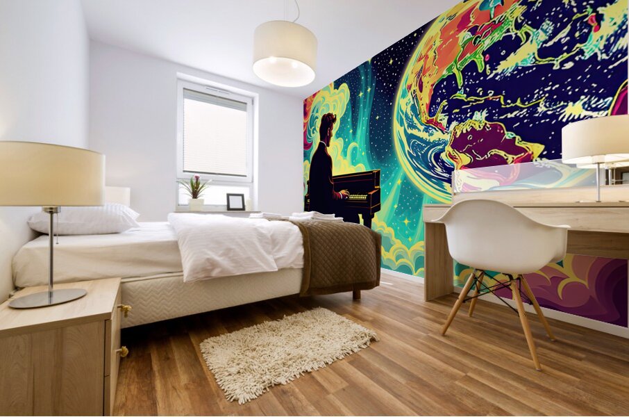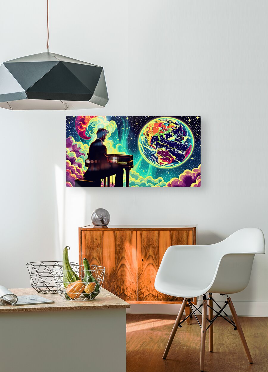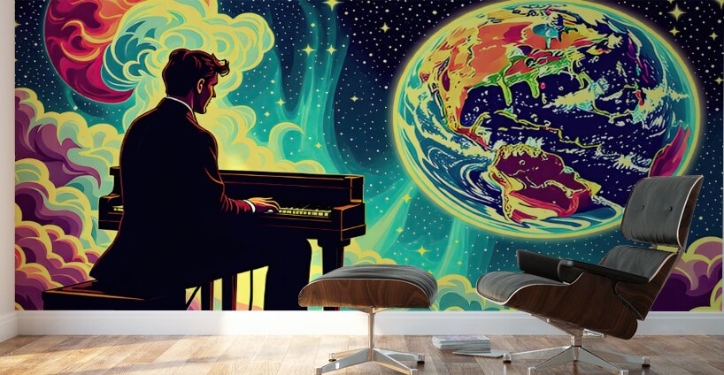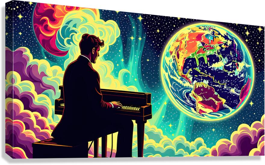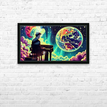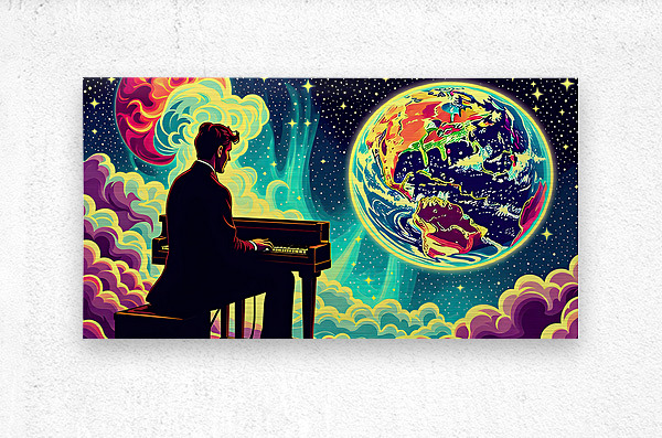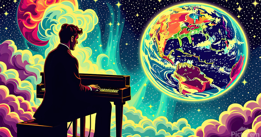 The image depicts a man in a suit, seated at a piano, playing with his back to the viewer. The setting appears to be outer space, with a vibrant, swirling nebula in the background. However, the most prominent elements are the celestial bodies: Earth: A stylized Earth, rendered in vivid, almost neon colors, occupies the right side of the image. The continents are recognizable but exaggerated, imbued with a psychedelic, dreamlike quality. Burning Planet: On the left, partially obscured by the nebula, is another planet. This one is ablaze in fiery hues of orange and yellow, suggesting intense heat and possible upheaval. The contrast between the Earth's beauty and the other planet's inferno creates a sense of dramatic tension. The man at the piano, seemingly undisturbed by his surroundings, becomes a point of focus. His presence suggests a story – is he playing a lament for a dying world, a celebration of Earth's resilience, or something else entirely? The overall effect is surreal and thought-provoking, blending the familiar image of a pianist with the vastness and mystery of space. This juxtaposition invites the viewer to contemplate themes of humanity, art, and the cosmos.