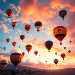 The image captures a breathtaking scene of numerous hot air balloons ascending into a vibrant, sunset-painted sky. Dozens of balloons, each a splash o...[+]