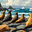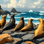 The image showcases a captivating scene of five sleek seals basking on sun-drenched rocks by the edge of a vibrant, azure ocean. Three of the seals ar...[+]