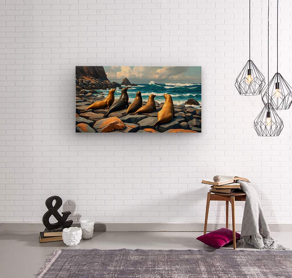 Five Seals Watching Waves  Wood print