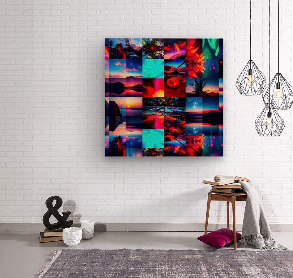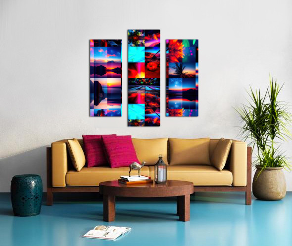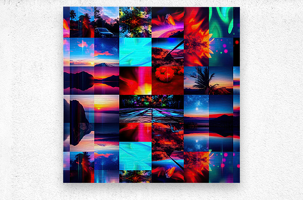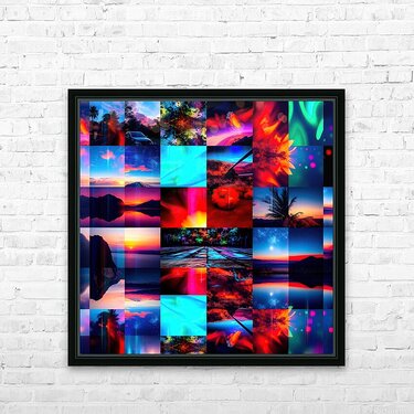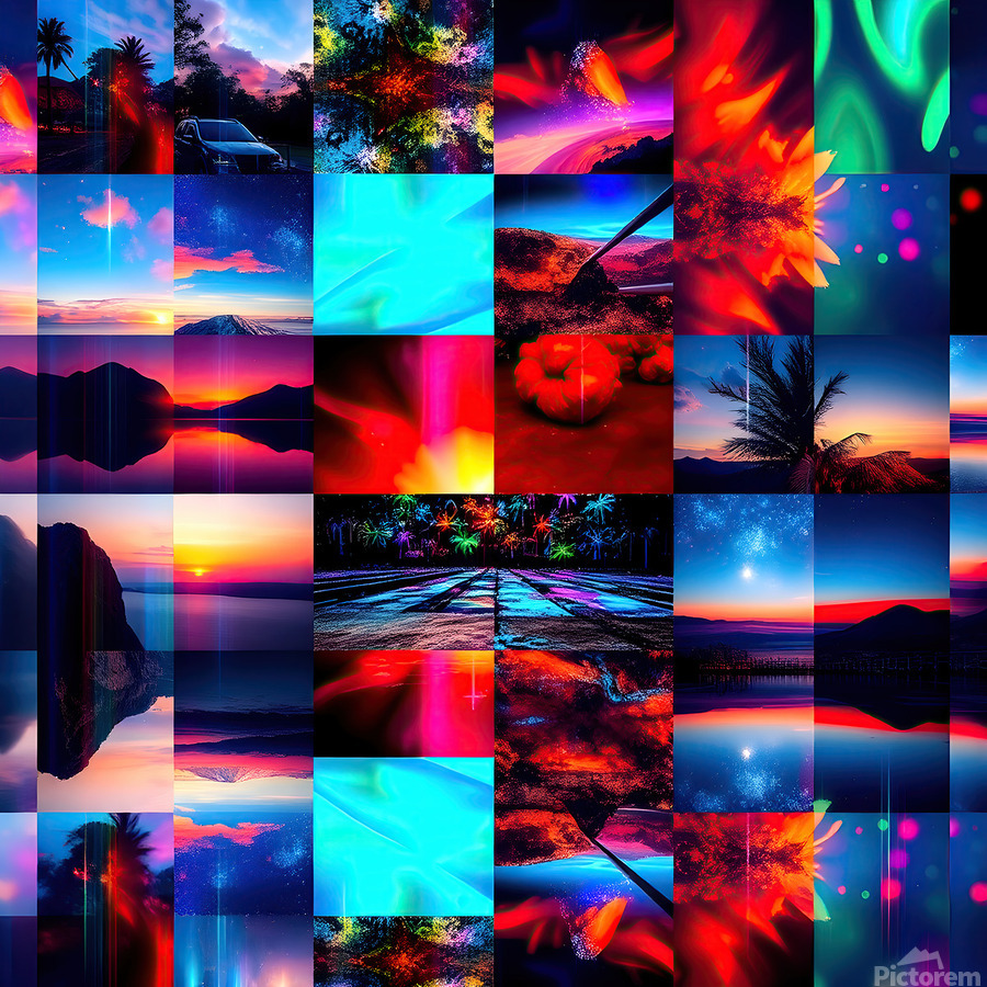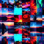 This image is a vibrant and dynamic collage of photographs, digitally manipulated to create a visually striking composition. Here's a breakdown of the elements and effects: Themes and Subjects: Landscapes: The collage features a mixture of natural landscapes including mountains, seascapes, sunsets and sunrises, palm trees, and starry night skies. Abstract and Cityscapes: Some images are more abstract, resembling nebulae or light paintings, and a few feature hints of cityscapes with cars and buildings. Visual Effects: Color Saturation and Manipulation: Colors are highly saturated, with intense blues, reds, pinks, oranges, and greens dominating different sections. This creates a sense of energy and otherworldliness. Mirroring: Several images are mirrored either vertically or horizontally, adding a sense of symmetry, repetition, and surrealism. Light Trails and Bokeh: Blurred streaks of light, often in contrasting colors, run through many of the images, mimicking motion or long exposures. Bokeh effects, where points of light are blurred, add depth and a dreamy feel. Collage Structure: The grid-like layout of the collage adds to the sense of rhythm and contrast, juxtaposing different scenes and color palettes. Overall Impression: The image evokes a sense of wonder, energy, and the sublime. It could be interpreted as representing a fantastical journey through different landscapes and atmospheres, or a visual representation of music or emotions. The collage's blend of natural and abstract imagery creates a dreamlike quality that invites the viewer to get lost in its beauty and dynamism.