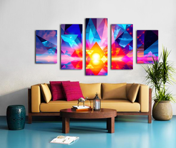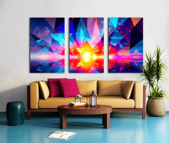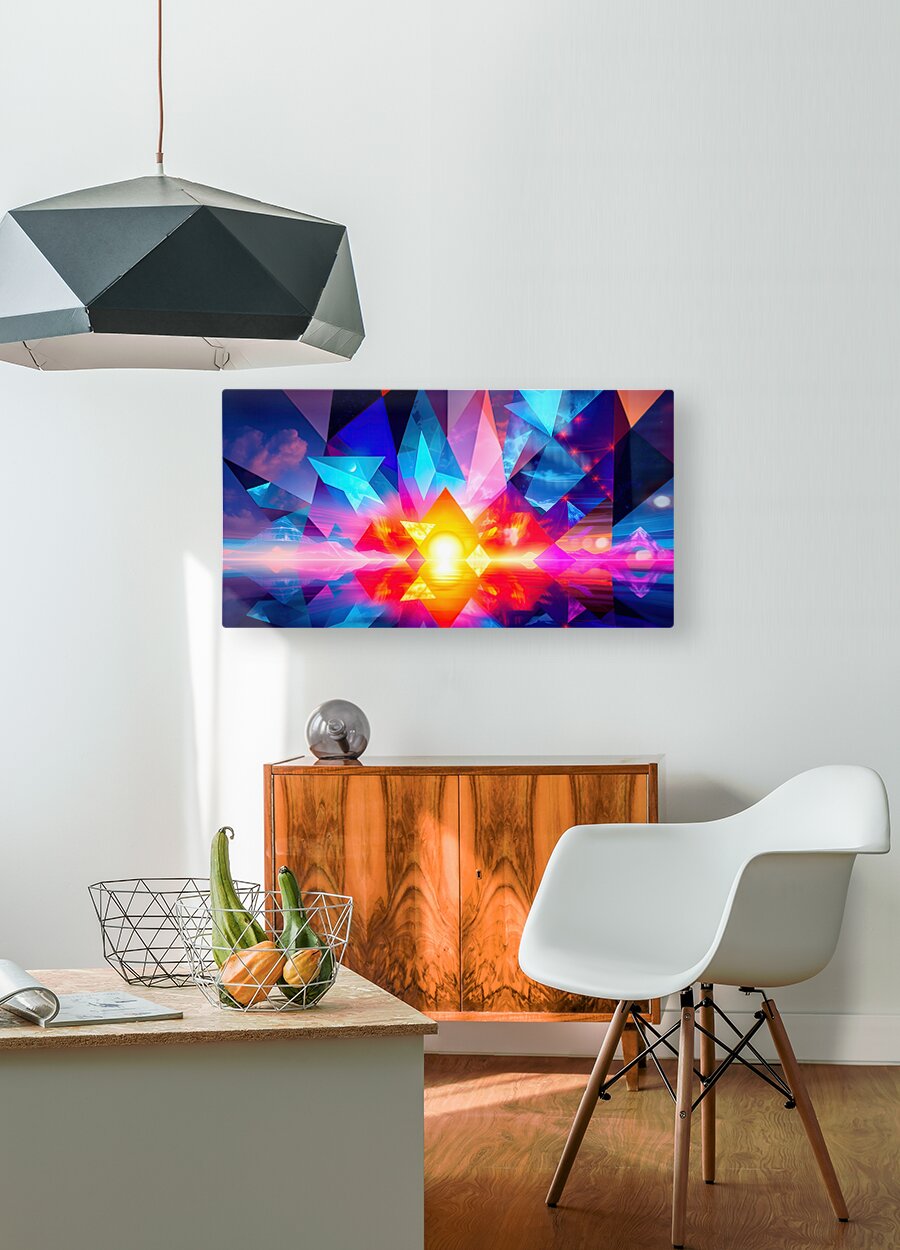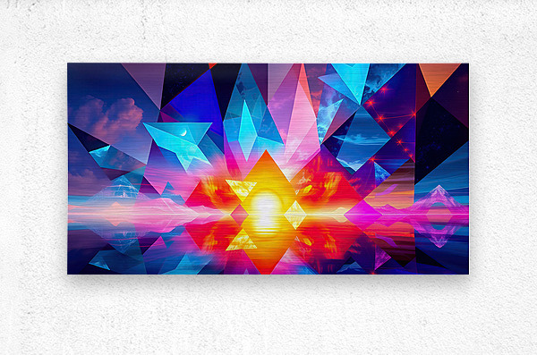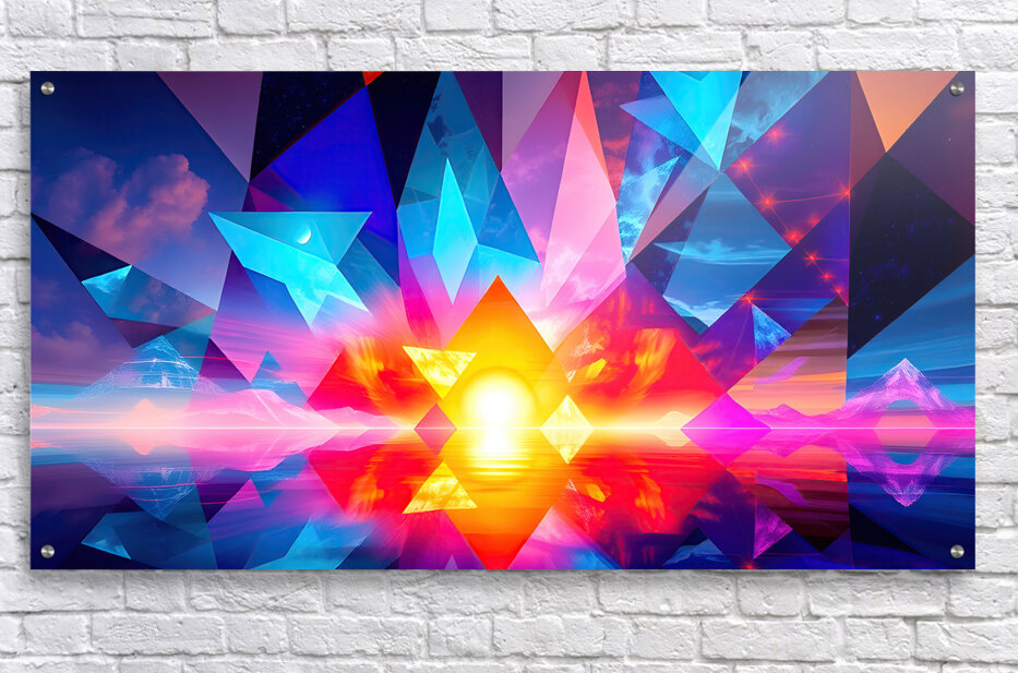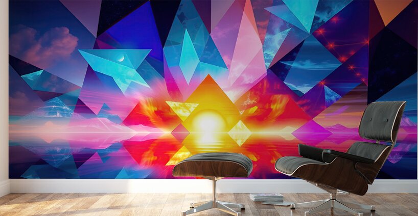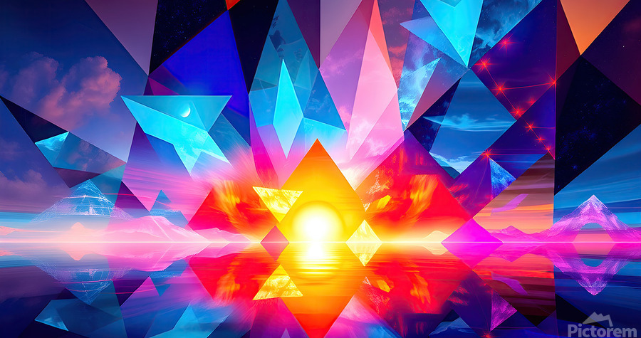 The image is an abstract, digital art piece with a focus on geometric shapes and vibrant colors. It depicts a scene that appears to be a sunset, reflected over water, with a surreal and abstract interpretation. Here's a breakdown of the elements: Central Focus: A large, radiant sun, centered low on the horizon, dominates the image with intense yellow and orange hues. Its reflection stretches across the water below, mimicking its shape. Geometric Overlay: Triangular and pyramidal shapes in various sizes are layered over the entire image. These shapes are rendered in bold, contrasting colors - predominantly blue, pink, and purple - creating a stained-glass effect against the warm backdrop of the sunset. Landscape Elements: Beneath the geometric layers, hints of a mountainous landscape are visible on the horizon. These mountains are depicted with minimal detail and soft color gradients, adding to the dreamlike quality of the scene. Sky and Water: The sky above the horizon is a blend of purple, pink, and blue with suggestions of clouds and stars. This gradient is mirrored in the water below, creating a sense of depth and symmetry. Overall, the image conveys a feeling of energy and vibrancy while simultaneously evoking a sense of tranquility associated with the sunset. The use of geometric abstraction and bold color choices creates a visually striking and modern interpretation of a natural scene