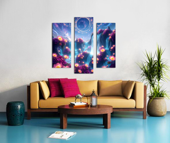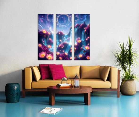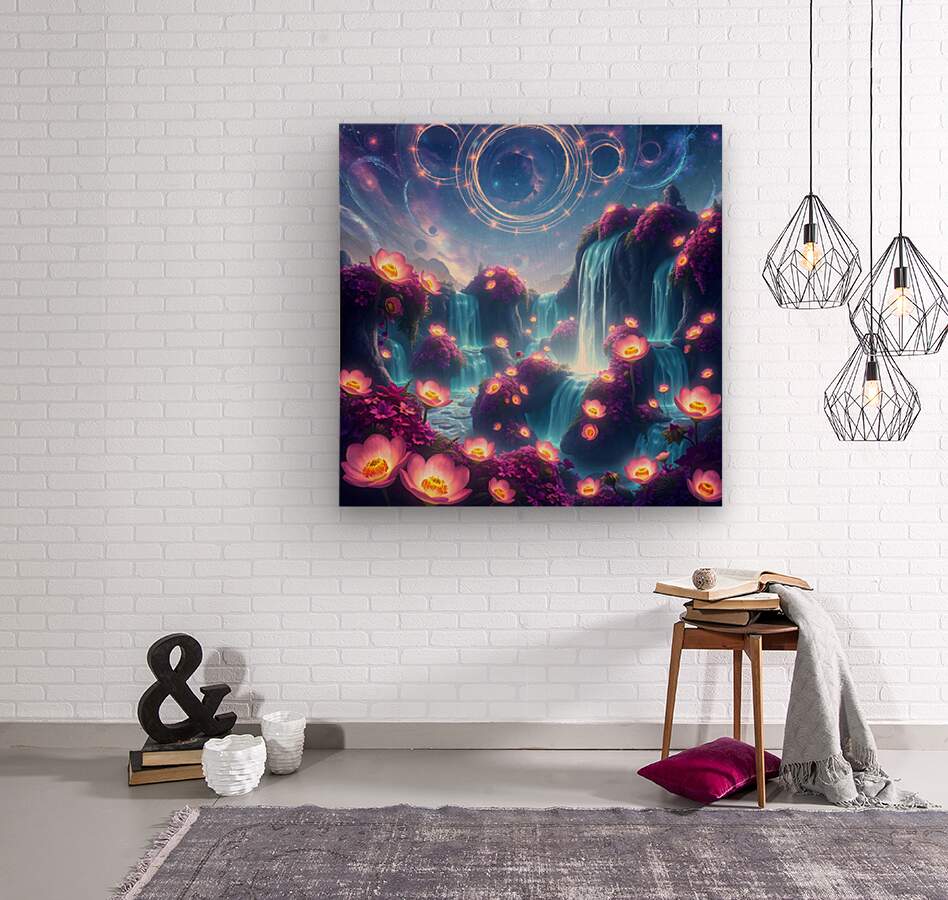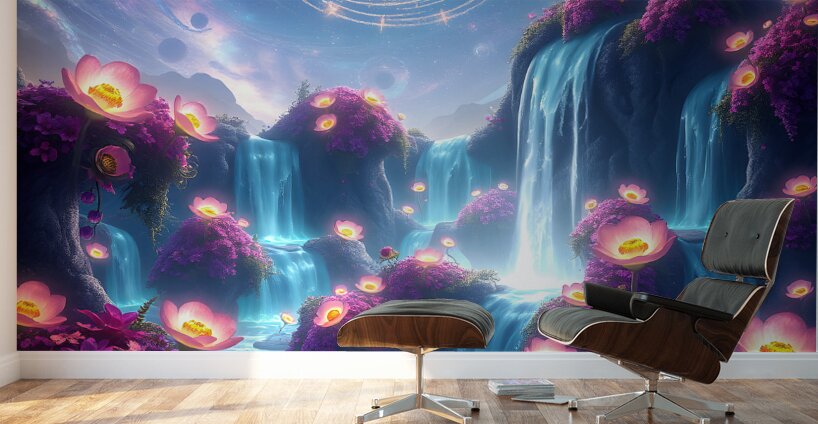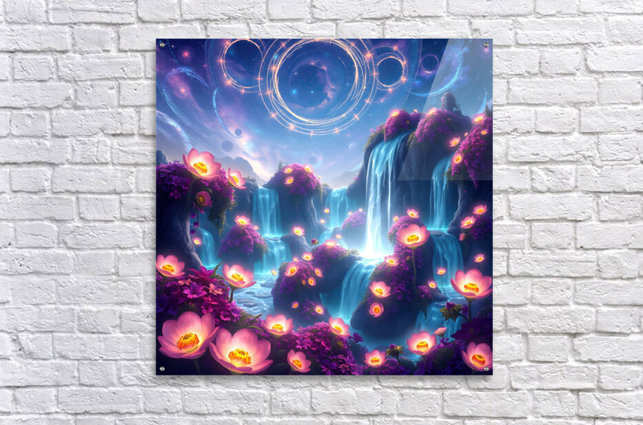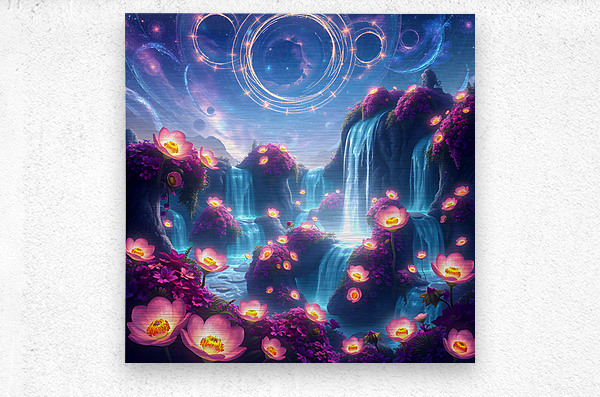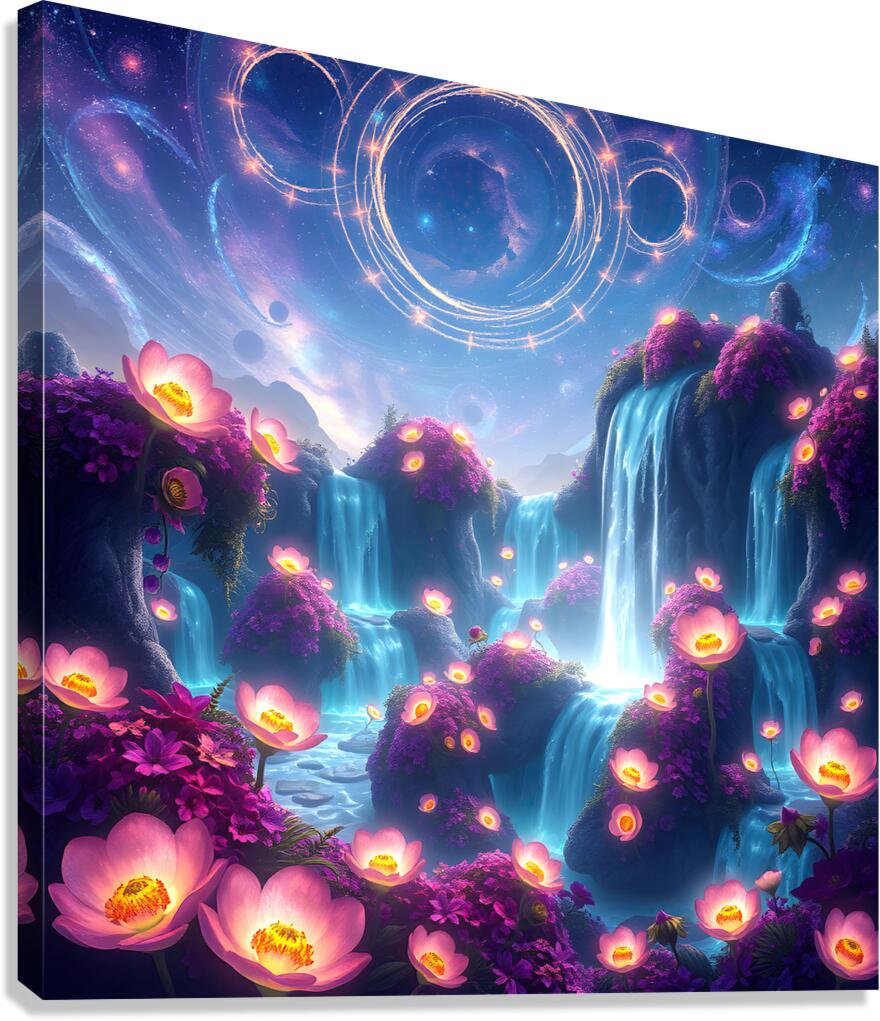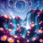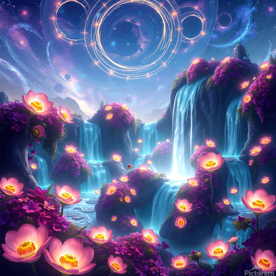 This digital art piece presents a mesmerizing, otherworldly landscape with waterfalls cascading down rock formations adorned with vibrant, luminescent flowers. The Waterfalls: Multiple waterfalls flow down from a shared source, their water an ethereal, almost glowing blue. They create a sense of movement and tranquility within the scene. The Flowers: Glowing pink and purple flowers are scattered across the artwork. They primarily bloom in clusters around the waterfalls, their luminescence adding to the magical atmosphere. Some flowers also appear to float in mid-air or on the surface of the water, enhancing the dreamlike quality of the scene. The Landscape: The land is composed of rock formations that appear to float and defy gravity. These formations are smooth and rounded, creating a sense of organic flow. The Sky: The backdrop features a deep blue night sky filled with stars and swirling nebulas. Bands of cosmic energy form rings in the sky, hinting at a celestial presence. Overall: This digital artwork evokes a feeling of peace, wonder, and otherworldly beauty. The vibrant colors, the luminescent elements, and the dreamlike landscape combine to create a truly captivating visual experience. It speaks to escapism and the allure of the unknown.