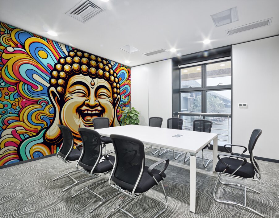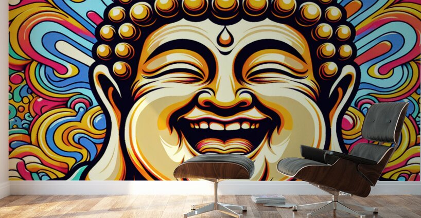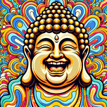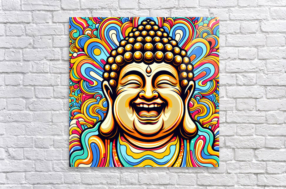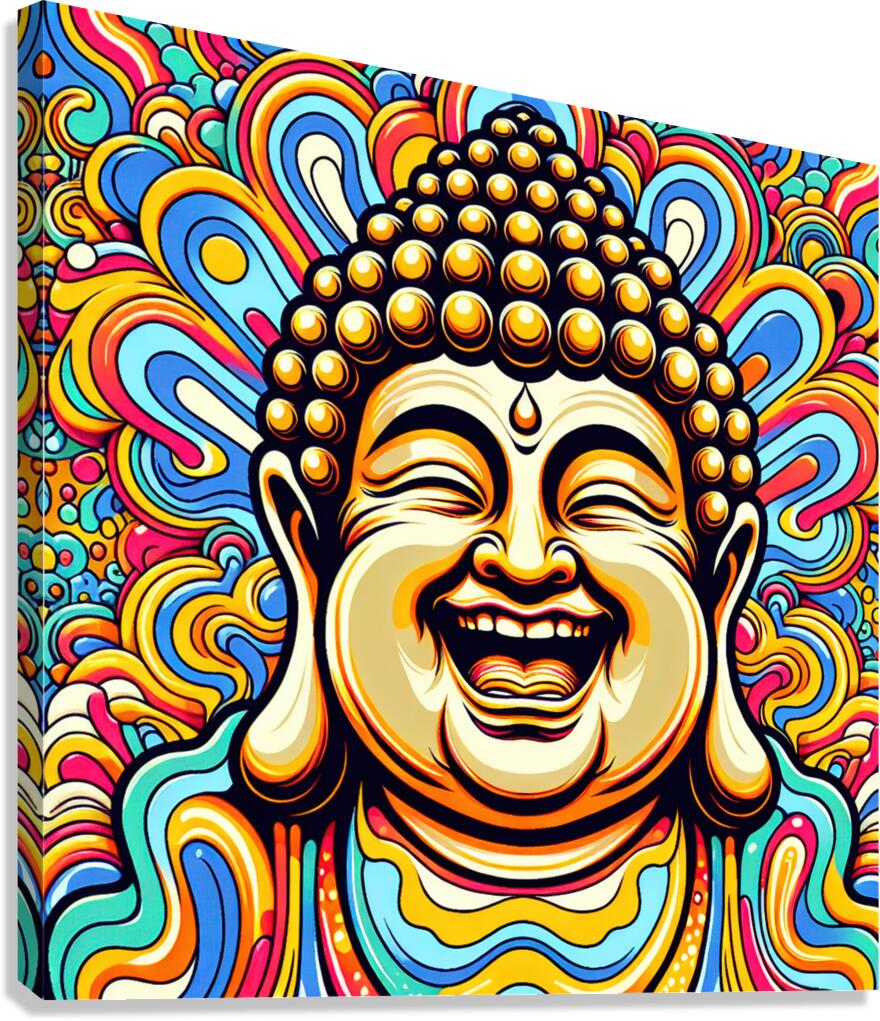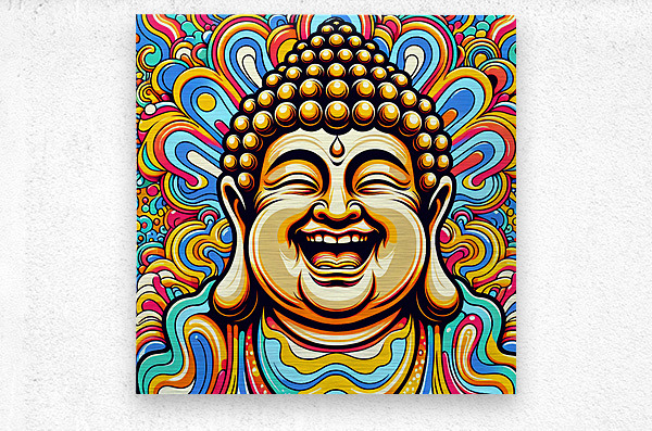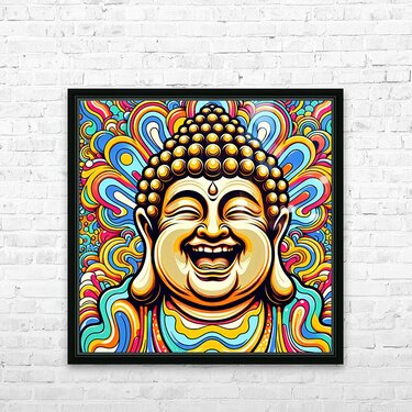 The image showcases a vibrantly colored portrait of a Buddha, crafted in a style reminiscent of pop art or psychedelic art. Here's a breakdown: The Buddha: The focal point is the Buddha's joyful face. His eyes are closed in a state of serene laughter, with wrinkles emphasizing his mirth. His mouth is wide open in a wide, genuine smile that suggests pure joy and enlightenment. The iconic topknot and shaved head are detailed with golden circles representing his enlightened consciousness. The Background: The background is a riot of swirling, colorful patterns. The shapes resemble stylized flames or clouds, reminiscent of traditional Buddhist and Hindu iconography. The colors are vivid and contrasting, creating a sense of dynamism and energy. The psychedelic nature of the background further emphasizes the transcendent, blissful state of the Buddha. Overall Impression: The image is striking and cheerful, presenting a joyous interpretation of Buddhist imagery. It merges traditional religious iconography with modern artistic styles, creating a piece that is both reverent and visually captivating.