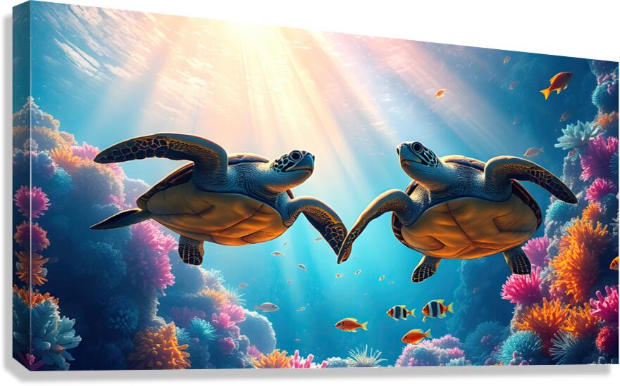The image shows two sea turtles swimming toward each other with their flippers outstretched almost touching in a crystal clear ocean. The reef and fish surrounding them are teeming with life and color. Orange, pink, and purple coral pop against the turquoise water. Sunlight is shining down on them from the surface of the water giving the feeling that the image is full of light. The overall tone of the image is peaceful and joyful.