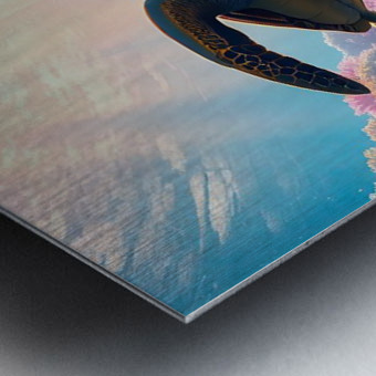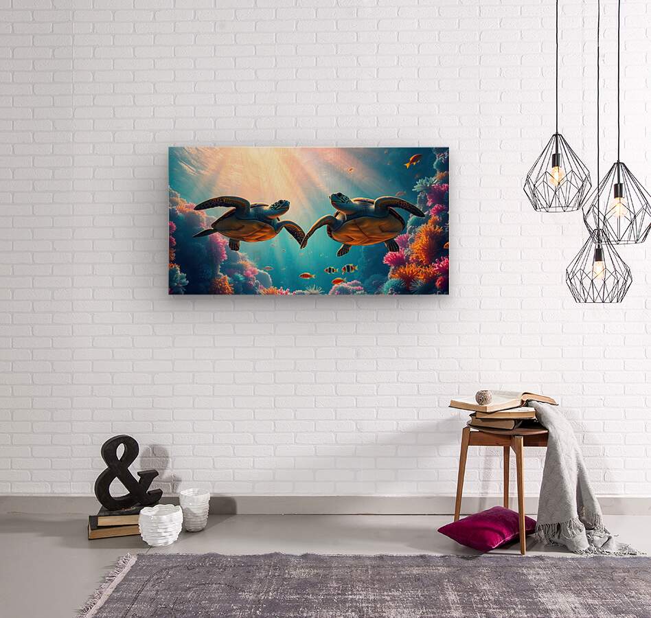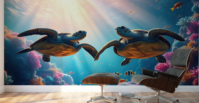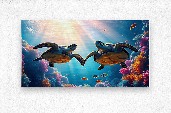 The image shows two sea turtles swimming toward each other with their flippers outstretched almost touching in a crystal clear ocean. The reef and fis...[+]