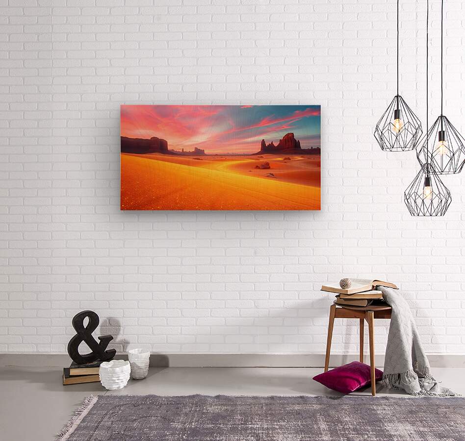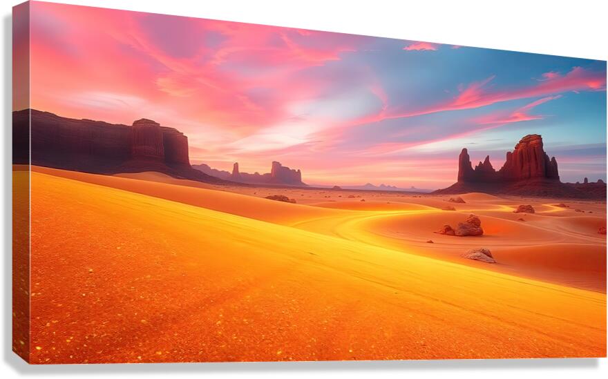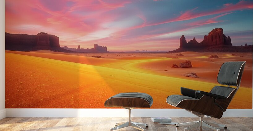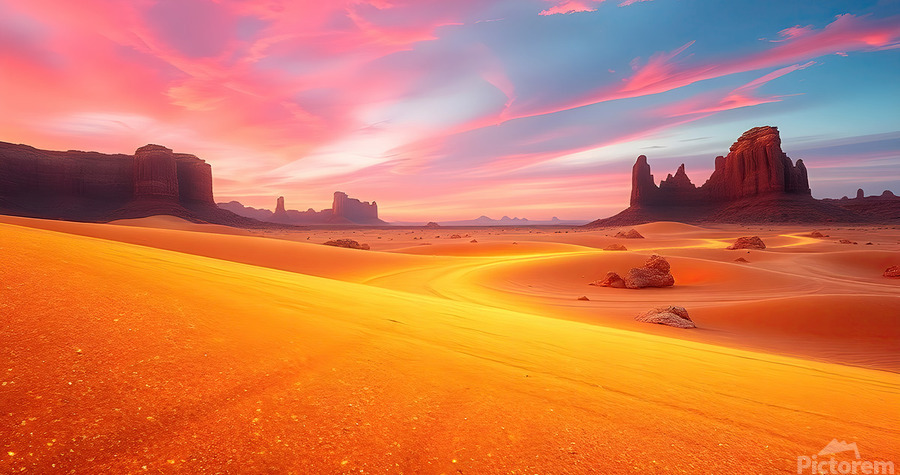 This breathtaking image showcases a vibrant desert landscape bathed in the golden light of a dramatic sunset. The scene is dominated by rolling, golden sand dunes, their peaks etched by the wind. In the distance, towering rock formations rise from the desert floor, their silhouettes casting long, dramatic shadows. The sky is ablaze with color, transitioning from fiery orange to deep purple. The clouds are streaked with pink and red hues, creating a breathtaking spectacle. The overall atmosphere is one of awe and wonder, capturing the raw beauty and vastness of the desert landscape.