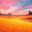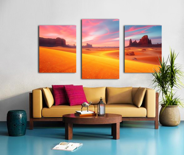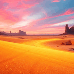 This breathtaking image showcases a vibrant desert landscape bathed in the golden light of a dramatic sunset. The scene is dominated by rolling, golde...[+]