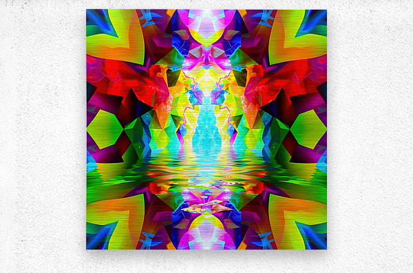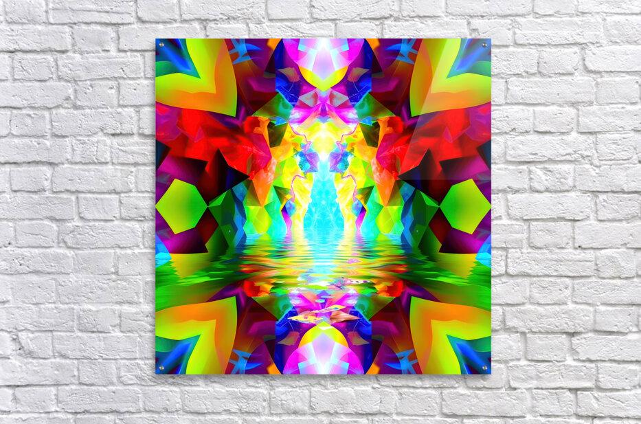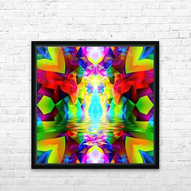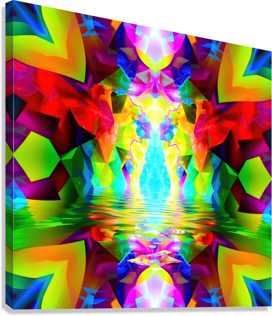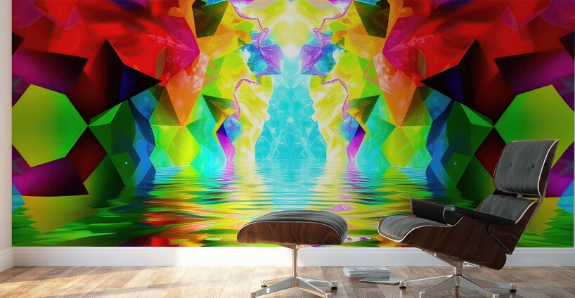 This image is a vibrant and abstract digital creation, showcasing a kaleidoscopic pattern with a focus on symmetry, color, and the illusion of depth. Here’s a breakdown of the key elements: Symmetry: The image is mirrored along a vertical axis, creating two identical halves that reflect each other perfectly. This symmetry enhances the sense of balance and harmony. Color Palette: The artwork explodes with an intensely saturated and diverse color palette. Vivid reds, yellows, greens, blues, and pinks are juxtaposed, creating a sense of energy and dynamism. The colors are not realistic but instead evoke a feeling of fantasy and otherworldliness. Shapes and Patterns: Geometric shapes, particularly triangles and polygons, are prominent throughout, forming intricate tessellations that draw the eye inwards. These shapes appear three-dimensional, suggesting a complex, faceted structure. Water Reflection: In the center of the image, a horizontal band suggests a water surface reflecting the vibrant scene above. This reflection adds another layer of depth and complexity to the artwork. Central Light Source: A bright, white light emanates from the center of the "water," drawing the viewer's focus to this point. This light seems to energize the surrounding colors, making them even more luminous. Overall, this abstract image is a celebration of vibrant color, dynamic shapes, and captivating symmetry. It invites the viewer to lose themselves in its intricate details and experience the pure joy of visual stimulation. The lack of any recognizable objects or scenes allows for open interpretation and invites personal reflection.